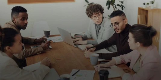 • SAP-Mitarbeitende stehen an einem großen Tisch in einem Meetingraum. Auf einem mobilen Bildschirm sind Mitarbeitende zugeschaltet. Eine Person in der Gruppe spricht gerade.